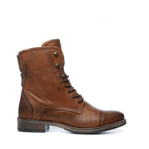 Dames veterboots van Manfield, uitgevoerd in leer. Het model heeft een vetersluiting, een decoratieve rits aan de achterzijde, een voering van leer en een comfortabele hak (3 cm).