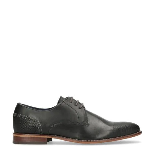 Heren veterschoen van Manfield, uitgevoerd in leer. Het model is voorzien van een vetersluiting, subtiele details op de neus en hiel, een leren binnenvoering en een rubberen loopzool.
