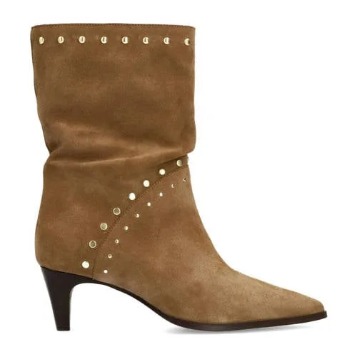 Deze halfhoge laars van Manfield heeft een suède buitenkant en een leren voering. De studs geven een stoere look en de hak zorgt voor comfort.