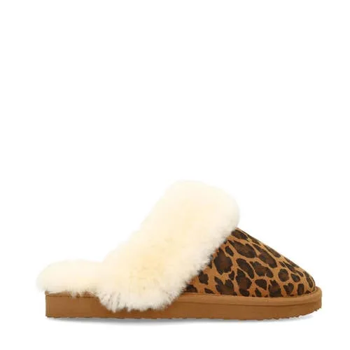 Manfield - Dames - Beige leopard pantoffels met bontvoering -...