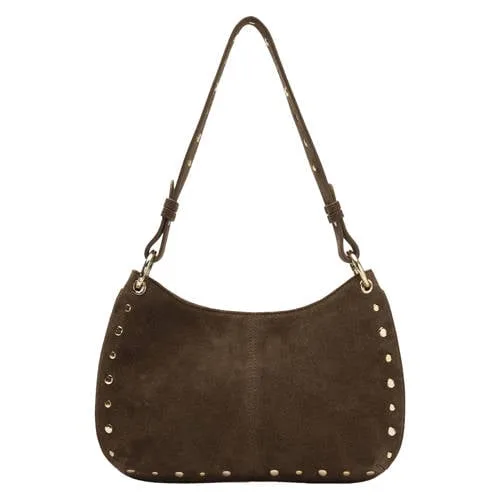 Manfield suede schoudertas met studs donkerbruin