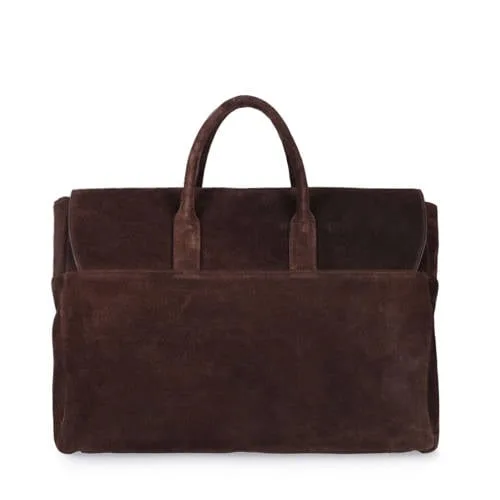 Donkerbruine suède shopper van Manfield met dubbele handvaten, drukknoopsluiting en ritssluiting. De shopper heeft een flap en een laptop vak aan de binnenzijde. De afmetingen zijn 51x35x17 cm, (BxHxD).
