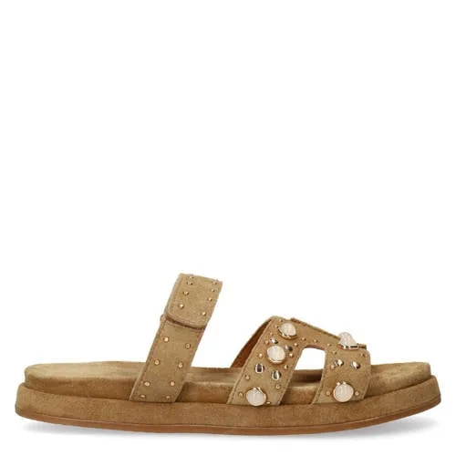 Deze beige suède dames slippers van Manfield combineren een rustige basis met subtiele eyecatchers. De cognac suède bandjes zijn afgewerkt met gouden en witte studs, wat een opvallend detail geeft zonder te druk te worden. De plateauzool van 3 cm zorgt voor net wat extra hoogte, terwijl de platte hak en normale leest prettig aanvoelen bij elke stap.Ontworpen voor dagelijks loopgemak Bovenkant, voering en bandje van zacht suède voor een soepele touch op de huid Beige kleur met cognac bandje en studs in goud en wit voor een rustige maar uitgesproken look Plateauzool van 3 cm die licht dempend werkt en extra hoogte geeft Platte zool en normale leest, passend bij de meeste voetvormen Rubberen buitenzool voor grip op gladde ondergronden Binnenzool van leer die na verloop van tijd prettig naar de voet vormt Klittenbandsluiting, zodat de band eenvoudig strakker of losser te zetten isCasual en vrouwelijk in éénDeze slippers zijn geschikt voor dagen waarop je veel loopt maar wel een verzorgde uitstraling wilt. Draag ze onder een losse broek, een zomerse jurk of een korte broek, de neutrale beige tint laat zich makkelijk combineren met lichte en warme kleuren.Manfield: schoenmode met oog voor detailManfield staat bekend om stijlvolle schoenen met aandacht voor materiaal en afwerking. In deze slippers zie je dat terug in de keuze voor suède, de leren binnenzool en de fijne details zoals de goudkleurige studs. Zo haal je een paar in huis dat er verzorgd uitziet en tegelijkertijd prettig draagt.Een comfortabele en opvallende basis voor zonnige dagen en lichte outfits.