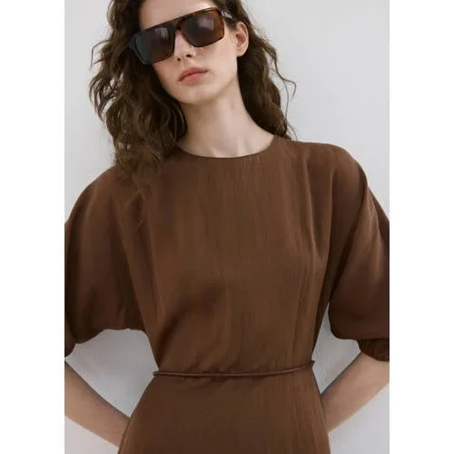 Deze bruine A-lijn jurk van lyocel vezel is een fijne basis voor zonnige dagen en lange zomeravonden. De middellange lengte en rechte snit geven een rustige, elegante uitstraling, terwijl de ceintuur in de taille toch vorm creëert. De stof voelt soepel en licht aan op de huid, ideaal voor een tuinfeest of een dag in de stad.Verfijnde details voor elke dag Gemaakt van 62% lyocel vezel en 33% viscose voor een zachte, soepele touch Middellange jurk met rechte snit voor een rustige en moderne look Ronde hals en driekwart mouw voor een luchtig maar aangekleed silhouet Ballonmouwen geven subtiel volume aan de schouders en armen Ceintuur in de taille om je taille te accentueren of losjes te knopen Verborgen ritssluiting aan de achterkant voor een nette afwerking Effen bruine kleur die zich makkelijk laat combineren met sandalen of hakkenIdeaal voor zomerse momentenVoor een tuinfeest, een etentje op het terras of een dag op kantoor, deze zomerjurk past zich eenvoudig aan jouw planning aan. Met sandalen en een lichte tas heb je een relaxte look, met verfijnde sieraden en hakken oogt de jurk direct een stuk feestelijker.Mango: moderne stijl met een frisse blikMango staat bekend om mode die aansluit op de laatste trends, maar wel draagbaar blijft in het dagelijks leven. De collecties combineren eigentijdse vormen met toegankelijke kleuren en doordachte details. Zo vul je je garderobe met items die je vaak en met plezier draagt.Een veelzijdige jurk die je gemakkelijk uit de kast pakt voor al je zomerse plannen.
