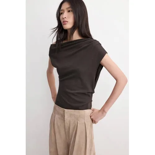 Deze donkerbruine asymmetrische top voor dames van Mango geeft je dagelijkse look een moderne uitstraling. De top heeft een aansluitende pasvorm en is gemaakt van een zachte katoenmix met modal en een beetje stretch, waardoor het materiaal soepel om het lichaam valt. Door het asymmetrische ontwerp en de subtiele rimpel- en plooidetails komt een eenvoudige outfit duidelijker tot zijn recht.Details die het verschil maken Katoenmix stof met 50% modal, 46% katoen en 4% elastomeer voor een zachte, soepele touch Asymmetrisch ontwerp met gerimpelde details voor een eigentijdse uitstraling Aansluitende rechte snit die het silhouet volgt Korte kapmouwen en rechte mouwen voor een luchtig zomers gevoel Ronde hals zonder sluiting, waardoor je de top eenvoudig aantrekt Effen donkerbruine kleur die gemakkelijk te combineren is Geschikt voor zowel standaardmaten als grote maten, onder de Daily collectieVeelzijdig in je zomergarderobeDeze top past goed in een zomerse garderobe. Combineer met een hoge jeans of een wijde broek voor een ontspannen look, of draag de top op een rok met sandalen voor warmere dagen. De effen kleur maakt het eenvoudig om sieraden en accessoires toe te voegen.Mango als eigentijds modemerkMango biedt moderne collecties met een duidelijke, actuele stijl. De ontwerpen zijn gemaakt voor dagelijks gebruik, met aandacht voor pasvorm, materiaal en details. Zo voeg je gemakkelijk kledingstukken toe aan je kast die je door meerdere seizoenen heen kunt blijven dragen.Een praktische basic met een asymmetrisch detail, passend bij dagelijkse outfits in de zomer.