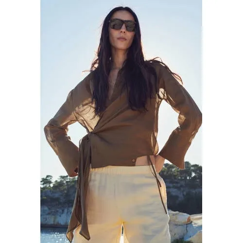 Deze bruine dames blouse met lange mouw van Mango is een rustige basic met subtiele details. De effen kleur en rechte snit geven een nette, ontspannen uitstraling, terwijl de klassieke overhemdkraag en knoopsluiting zorgen voor een tijdloze look. Gemaakt van 100% ramie voelt de stof luchtig en licht aan, ideaal voor het voorjaar en frisse lentedagen.Verfijnde details in een dagelijkse blouse Gemaakt van 100% ramie, een soepele, ademende stof met een natuurlijke uitstraling Rechte snit voor een ontspannen, maar verzorgde pasvorm Klassieke overhemdkraag en voorste knoopsluiting voor een nette look Lange mouwen met knoopmanchetten, handig om ook op te rollen Strikdetail dat je taille subtiel accentueert Effen bruine kleur die gemakkelijk combineert met jeans, pantalon of rok Geen borstzakken voor een rustig en clean voorpandGeschikt voor werk, weekend en alles daartussenDeze blouse past goed in een dagelijkse garderobe. Draag hem naar kantoor op een rechte broek of gecombineerd met een midi-rok, of casual in je vrije tijd met een lichte jeans en sneakers. De lichte ramie stof maakt het een praktische keuze voor laagjes in het voorjaar.Mango: moderne mode voor elke dagMango staat bekend om moderne collecties die trends vertalen naar draagbare items voor elke dag. Met aandacht voor pasvorm, materialen en rustige kleuren maakt Mango het eenvoudig om een garderobe op te bouwen die je het hele seizoen door kunt blijven dragen.Een veelzijdige blouse die je garderobe gemakkelijk aanvult met een natuurlijke, rustige uitstraling.