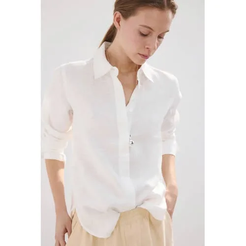 Deze witte linnen dames blouse van Mango is een luchtige basic voor zonnige dagen. De rechte snit valt ontspannen langs het lichaam en de klassieke overhemdkraag geeft een rustige, verzorgde uitstraling. Gemaakt van 100% linnen voelt de stof koel en ademend aan, ideaal voor warme zomermaanden of een drukke werkdag.Details die je elke dag draagt Gemaakt van 100% linnen voor een luchtig en ademend gevoel Witte effen kleur, makkelijk te combineren met verschillende stijlen Rechte pasvorm voor een ontspannen, comfortabele look Klassieke overhemdkraag voor een verzorgde uitstraling Lange mouwen met knoopmanchetten, opgerold of lang te dragen Knoopsluiting aan de voorkant voor eenvoudig aan- en uittrekken Geschikt voor dagelijks gebruik in de zomercollectieVeelzijdig in je dagelijkse garderobeDoor de effen witte kleur past deze blouse gemakkelijk bij je bestaande garderobe. Combineer met een luchtige linnen broek voor een zomerse set of draag de blouse open over een top met een jeans. De lange mouwen kun je oprollen voor een meer casual stijl.Mango: moderne stijl voor elke dagMango is een internationaal modebedrijf met roots in Spanje, bekend om eigentijdse collecties die inspelen op het dagelijks leven. De focus ligt op toegankelijke mode met een moderne uitstraling, waarbij pasvorm en draagbaarheid centraal staan. Zo voeg je met deze blouse een betrouwbaar en stijlvol kledingstuk toe aan je kast.Een frisse basis waarmee je eenvoudig verschillende zomerse looks samenstelt.