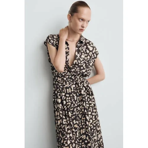 Deze Mango dames jurk viscose bruin all over print combineert het gevoel van een luchtige blouse met het silhouet van een elegante jurk. De middel lange lengte valt rond de knie tot kuit en volgt soepel de lijn van het lichaam. De all over print in bruintinten zorgt voor een rustig maar opvallend dessin dat makkelijk te combineren is met neutrale accessoires.Verfijnde details voor dagelijks draaggemak Gemaakt van viscose die soepel valt en prettig aanvoelt op de huid Korte rechte mouwen voor een luchtig en comfortabel gevoel Klassieke kraag en volledige knoopsluiting aan de voorkant Ceintuur in de taille voor een verstelbare pasvorm Middel lange lengte die geschikt is voor verschillende gelegenheden All over print in bruine kleur voor een tijdloze uitstraling Zonder zakken voor een glad en rustig silhouetVeelzijdig in elke settingMet deze blousejurk ontstaat gemakkelijk een verzorgde look voor kantoor, een etentje of een dagje in de stad. De knoopsluiting maakt het eenvoudig om de halslijn iets te openen of juist hoger te sluiten, terwijl de ceintuur de taille naar wens accentueert.Mango: moderne stijl met oog voor detailMango staat voor eigentijdse mode met heldere lijnen en doordachte pasvormen. De collecties sluiten aan op actuele trends, met aandacht voor draagcomfort en veelzijdigheid. Zo biedt Mango kledingstukken die seizoen na seizoen een vaste plek in de garderobe kunnen krijgen.Een jurk die moeiteloos meebeweegt met drukke dagen en ontspannen momenten.