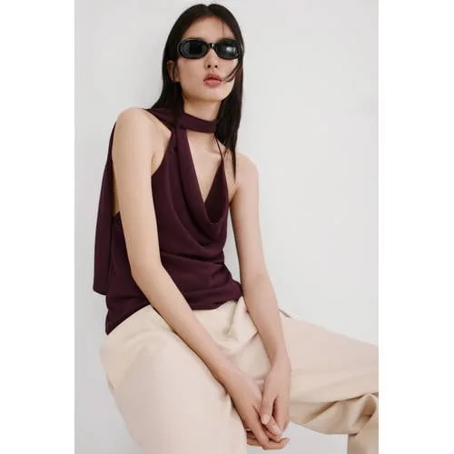 Deze donkerrode blousetop met spaghettibandjes van Mango is een luchtige keuze voor warme dagen en lange avonden. De effen kleur laat zich makkelijk combineren met je favoriete broeken en rokken. Dankzij de soepele, geweven stof valt de top mooi langs je lichaam en voelt de stof licht aan op de huid.Verfijnde details voor elke dag Donkerrode kleur die mooi staat bij zowel lichte als donkere onderstukken Spaghettibandjes zorgen voor een open, zomerse look Sjaalkraag geeft een elegante touch aan deze blousetop Geweven, soepele stof voor een lichte en luchtige uitstraling Ritssluiting voor eenvoudig aan- en uittrekken Effen design, ideaal als basisstuk in je garderobe Onderdeel van de Mango Daily collectie, geschikt voor alledaagse outfitsVan werkdag tot zomeravondVoor een relaxte zomerdag combineer je deze top met een wijde jeans en sandalen. Ga je de stad in of heb je een etentje, dan past hij ook goed op een zwarte broek met hakken. Door het rustige ontwerp kun je spelen met sieraden en tassen om je look net zo uitgesproken of juist subtiel te maken als jij wilt.Mango: eigentijdse stijl met aandacht voor detailMango staat bekend om modieuze items met een toegankelijke uitstraling. De collecties volgen de trends, maar blijven toch draagbaar voor elke dag. Met deze top haal je een doordacht ontworpen kledingstuk in huis dat stijl en comfort op een natuurlijke manier samenbrengt.Een veelzijdige zomertop die je garderobe eenvoudig aanvult.