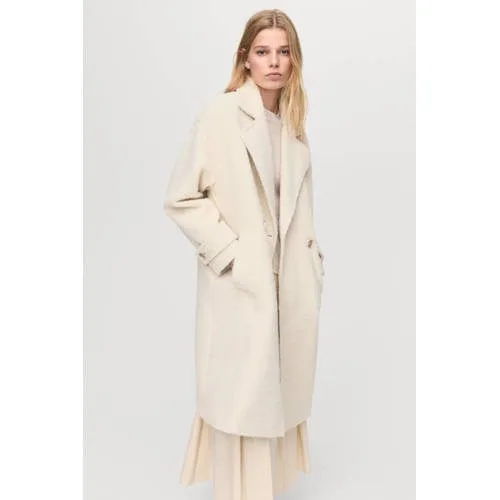 Deze Mango jas heeft lange mouwen en een reverskraag. Deze jas in een lichte kleur valt tot over de heupen met knoopsluiting en zakken, geschikt voor koude winterdagen.