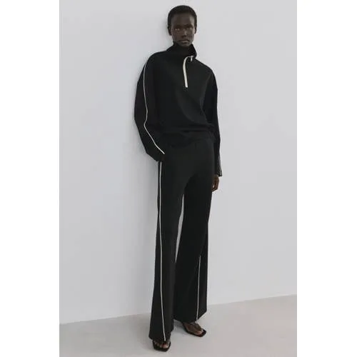 Geef je dagelijkse outfits een moderne upgrade met deze Mango sweater. De korte, boxy pasvorm in zwart met contrasterende strepen creëert een grafische look die direct opvalt, terwijl de opstaande kraag met ritssluiting zorgt voor een sportieve touch. De trui is onderdeel van een co-ord set, maar laat zich ook makkelijk los dragen boven je favoriete broeken of rokken.Kenmerken die je elke dag wilt dragen Korte, boxy pasvorm die ontspannen rond je lichaam valt Zwarte kleur met contrasterende strepen voor een strak lijnenspel Opstaande kraag met ritssluiting voor variatie in je halslijn Lange, rechte mouwen voor een rustige, tijdloze uitstraling Effen ontwerp zonder zakken voor een clean silhouet Zachte, soepele stof die comfortabel aanvoelt op de huid Onderdeel van een co-ord set voor een volledige total lookVan werkdag tot weekendDeze trui komt uit de Daily collectie en past bij dagen waarop je makkelijk wilt kunnen schakelen. De hoge hals kun je gesloten dragen voor extra warmte of een strakkere look, en iets open geritst voor een meer relaxte stijl. Ideaal voor lenteweer waarbij je graag laagjes draagt.Mango: eigentijdse mode met een frisse blikMango staat bekend om modieuze items met een toegankelijke uitstraling. De collecties volgen de trends, maar blijven altijd draagbaar voor elke dag. Met deze trui kies je voor een doordacht ontwerp dat je garderobe langdurig aanvult.Een veelzijdige sweater die je kast klaar maakt voor vele combinaties en momenten.