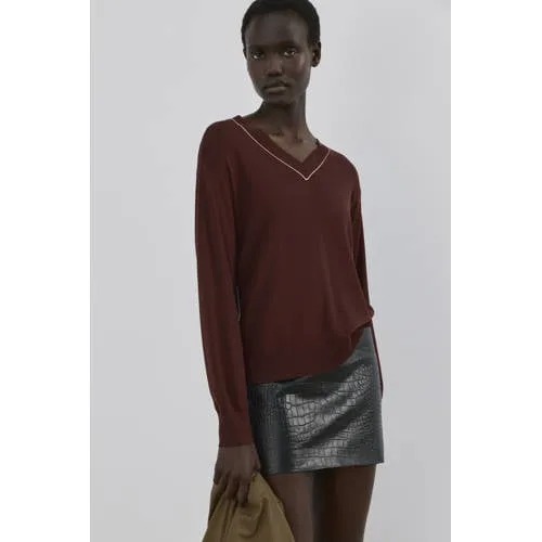 Deze zachte gebreide trui van Mango is een fijne basis voor elke dag. De elegante Mango trui met V-hals heeft contrasterende gekleurde biesjes langs de hals en randen, waardoor de eenvoudige effen look net iets meer karakter krijgt. De rechte lange mouwen en het ontbreken van een sluiting zorgen voor een rustige, verzorgde uitstraling die makkelijk combineert met je bestaande garderobe.Verzorgde details voor elke dag Gebreide stof met een gladde structuur voor een comfortabele touch op de huid V-hals die mooi valt en ruimte laat voor een ketting of sjaal Contrasterende gekleurde biesjes langs hals en boorden voor een subtiel accent Lange, rechte mouwen voor een tijdloos silhouet Zonder sluiting, waardoor de trui soepel over je outfit valt Gemaakt van 83% viscose en 17% polyamide, voor een soepele en vormvaste pasvorm Verkrijgbaar in plus maten, waardoor er meer keuze is voor verschillende lichaamstypenComfortabel te dragen in allerlei situatiesDeze trui is geschikt voor zowel ontspannen dagen thuis als een nette werkdag. Draag de trui los over een broek of rok, of combineer met een hemdje eronder voor wat extra warmte. De effen kleur maakt het makkelijk om te stylen met andere items in je kast.Mango: moderne mode met aandacht voor pasvormMango staat bekend om eigentijdse mode met heldere lijnen en draagbare ontwerpen. De focus ligt op goede pasvormen en materialen die prettig aanvoelen, zodat je je de hele dag zeker en comfortabel voelt in je outfit.Een rustige, stijlvolle trui die je keer op keer uit de kast pakt.