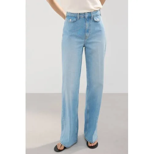 Deze lichtblauwe dames flared jeans met wide leg van Mango zorgt voor een moderne, ontspannen uitstraling. De denimachtige katoenen stof valt soepel langs je benen en de wijd uitlopende pijpen zorgen voor een rechte lijn van heup tot zoom. De middelhoge taille sluit aan rond je middel en benadrukt je silhouet zonder strak te zitten.Verfijnde details in lichtblauw denim Wide leg model met lange pijpen voor een vloeiende lijn langs je benen Middelhoge taille met riemlussen zodat je eenvoudig je favoriete riem draagt Twee klepzakken aan de voorkant voor een subtiel detail Twee opgestikte zakken aan de achterkant voor een herkenbare jeanslook Gemaakt van 99% katoen en 1% elastomeer voor een stevige stof met lichte stretch Haak-, knoop- en ritssluiting voor een nette, stabiele tailleband Effen light blue denim, geschikt als frisse basis in je garderobeVoor dagelijks gebruik en zomerse outfitsDeze flared jeans past goed in je dagelijkse garderobe. Combineer met een eenvoudig T-shirt en sneakers voor een relaxte daglook, of kies een luchtige blouse en sandalen voor warme zomerdagen. De lange pijpen en de regular waist maken het een broek die je makkelijk vaak draagt.Mango: moderne stijl voor elke dagMango staat bekend om eigentijdse mode met een heldere lijn. De collecties volgen de trends, maar blijven draagbaar voor elke dag. Met deze jeans kies je voor een basisitem dat past binnen de herkenbare Mango stijl, met aandacht voor pasvorm en details.Een flared jeans waarmee je eenvoudig verschillende looks samenstelt.