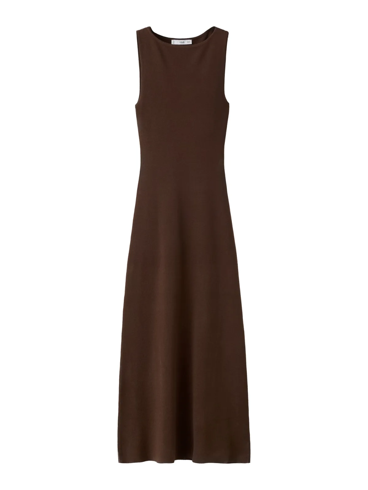Deze donkerbruine gebreide midi jurk van Mango is een fijne basis voor dagen waarop je zonder nadenken goed gekleed wilt zijn. Het getailleerde ontwerp volgt soepel je silhouet, terwijl de middellange lengte voor een rustige, moderne look zorgt. De boothals en brede bandjes geven de jurk een nette uitstraling die zowel overdag als in de avond past.Kenmerken van deze donkerbruine midi jurk Midi ontwerp dat tot halverwege het been valt voor een rustige lengte Getailleerde pasvorm die je figuur subtiel accentueert Boothals en brede bandjes voor een rustige, open halslijn Mouwloos model, ideaal voor warme dagen of met een laagje erover Gemaakt van een zachte, fijn gebreide stof met 71% viscose Effen donkerbruine kleur die gemakkelijk te combineren is Zonder sluiting, je schiet de jurk eenvoudig aan en uit Beschikbaar in standaardmaten en in grote matenVan zomerdag tot avondje uitVoor een zomerse werkdag draag je deze jurk met sandalen en een lichte cardigan. Ga je door naar een etentje, dan wissel je simpel naar hakken en een compacte schoudertas. De effen kleur laat ruimte voor sieraden of een opvallende tas.Mango: eigentijdse mode voor elke dagMango staat bekend om moderne collecties met een toegankelijke stijl. De ontwerpen sluiten aan bij het dagelijks leven, met items die je makkelijk combineert en vaak draagt. Zo voeg je met deze jurk een praktische keuze toe aan je garderobe.Een jurk die je het hele zomerseizoen blijft pakken.