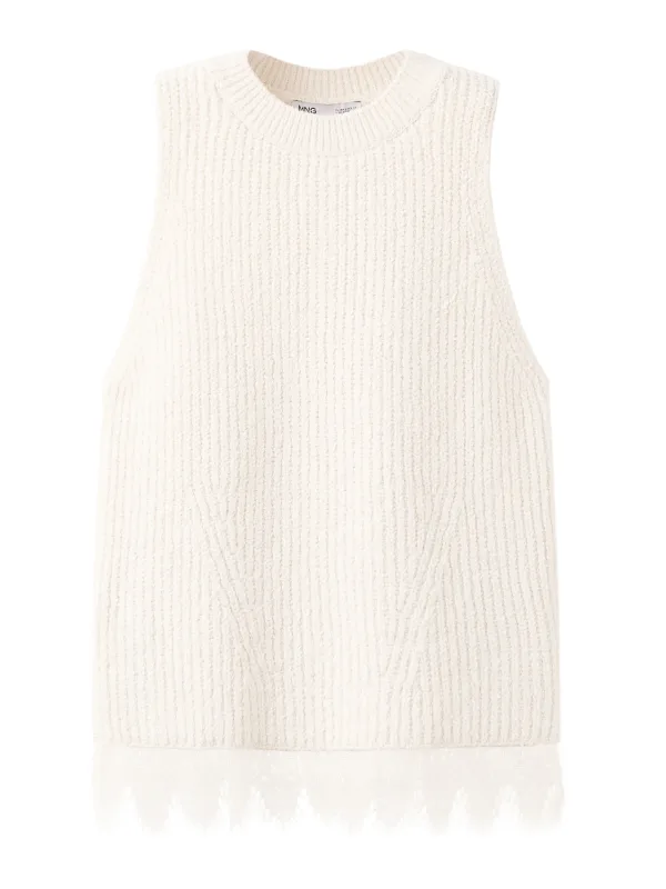 Deze ecru dames top van Mango is een praktische basic met kantdetails voor een zachte uitstraling. De top is middengrof gebreid met een ribstructuur, heeft een rechte snit en een ronde hals. De mouwloze vorm en brede schouderbanden zorgen voor een rustige lijn langs je schouders. De kanten biesjes langs de hals en armsgaten voegen een extra detail toe dat de top een eigen karakter geeft.Details die je elke dag kunt dragen Middengrof, ribgebreid breisel voor een licht rekbare en comfortabele fit Rechte pasvorm die recht langs je lichaam valt Ronde hals en mouwloos design met brede schouderbanden Kanten biesjes langs hals en armsgaten voor een zorgvuldige afwerking Effen ecru kleur, makkelijk te combineren met je zomerfavorieten Zonder sluiting, je trekt de top eenvoudig over het hoofd aan Bevat katoen en een beetje elastomeer voor extra soepelheidVeelzijdig in je dagelijkse garderobeDeze ecru top past goed bij je dagelijkse looks. Combineer met een wijde linnen broek en sandalen voor een lichte zomerse outfit, of draag hem in een hoge jeans met een blazer voor een ontspannen stijl op kantoor of tijdens een etentje.Mango: moderne stijl voor elke dagMango staat bekend om eigentijdse mode met een heldere, vrouwelijke stijl. De collecties zijn ontworpen met oog voor detail en draagbaarheid, zodat je items makkelijk met elkaar combineert. Met deze top haal je een kledingstuk in huis dat past binnen een moderne garderobe en dat je seizoen na seizoen blijft dragen.Een basic met kanten details voor veel verschillende momenten op je dag.