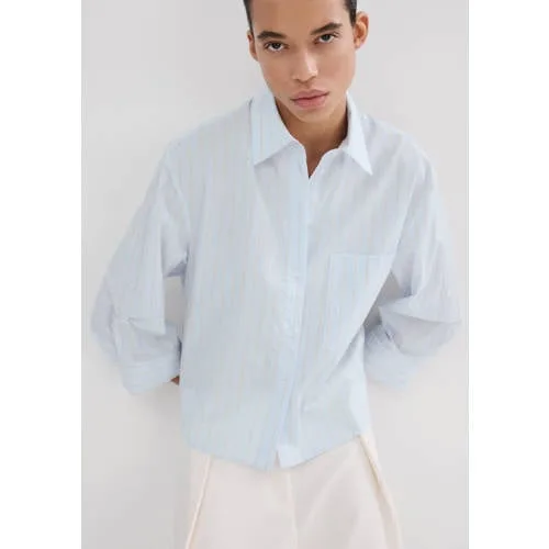 Deze gestreepte Mango katoenen blouse is een fijne basis voor elke dag. De combinatie van blauwe en witte strepen oogt fris en rustig, terwijl de rechte pasvorm zorgt voor een ontspannen silhouet. Gemaakt van 100 procent katoen voelt de stof zacht en luchtig aan, ideaal voor lentedagen en wisselvallig weer. De klassieke overhemdkraag en lange mouwen met knoopmanchetten geven de blouse een tijdloze uitstraling die je makkelijk aanpast aan jouw dag.Details die je elke dag gebruikt Gemaakt van 100 procent katoen, prettig ademend en comfortabel op de huid Recht model dat soepel langs het lichaam valt Blauw wit streepdessin voor een rustige, heldere look Overhemdkraag en lange mouwen met knoopmanchetten voor een nette afwerking Voorzijde met knoopsluiting, handig om open of dicht te dragen Borstzak als subtiel detail Verkrijgbaar in standaardmaten en grote maten, passend bij verschillende lichaamstypesVeelzijdig in je dagelijkse outfitsDeze blouse past goed in je dagelijkse garderobe. Draag het model op een jeans voor een ontspannen werkdag, of combineer met een nette broek voor een meer geklede uitstraling. Ook open over een T-shirt geeft de blouse een casual laagje extra.Mango: eigentijdse mode voor elke dagMango staat bekend om moderne ontwerpen met een heldere stijl, geschikt voor het dagelijks leven. Met aandacht voor pasvorm en draagcomfort biedt het merk collecties die aansluiten op de wensen van vrouwen die houden van toegankelijke mode met een verzorgde uitstraling.Een frisse blouse waarmee je eenvoudig een verzorgde look creëert, elke dag opnieuw.