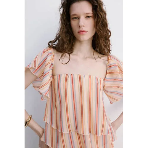 Op zoek naar een opvallende zomerse top die zich makkelijk aanpast aan je dag? Deze Mango dames top combineert een rechte snit met speelse details, zodat je zonder moeite een verzorgde look neerzet. Het gestreepte patroon in multi kleur geeft een frisse uitstraling en zorgt dat de top mooi opvalt, of je nu een jeans, rok of korte broek draagt.Verrassende details en slimme pasvorm Rechte snit voor een ontspannen, maar verzorgde look Gestreept patroon in multi kleur voor een levendige uitstraling Ruches detail langs de bovenkant voor een feminine touch Afneembare korte vlindermouwen, zodat je kunt kiezen tussen off shoulder en strapless Off shoulder kraagvorm benadrukt de schouders op een stijlvolle manier Ritssluiting aan de achterkant voor makkelijk aan- en uittrekken Gevoerde binnenkant voor een comfortabel gevoel op de huid Geen zakken, waardoor het silhouet rustig en slank oogtVan dagelijkse look tot zomeravondDeze top uit de 'Daily' collectie leent zich goed voor warme zomerdagen. Overdag draag je de vlindermouwen voor een luchtige, casual look. Laat je de mouwen thuis, dan heb je in één keer een strapless top die ook geschikt is voor een etentje of een avond op het terras.Mango: eigentijdse stijl voor elke dagMango staat bekend om eigentijdse mode met een toegankelijke stijl. De collecties volgen de trends, maar blijven draagbaar voor elke dag. Met deze top haal je een doordacht ontworpen item in huis dat goed past binnen een moderne, veelzijdige garderobe.Een veelzijdige keuze die je zomergarderobe een frisse update geeft.