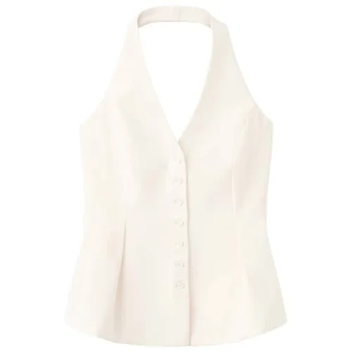 Geef je outfit een moderne, vrouwelijke aanvulling met dit dames gilet van Mango in de kleur ecru. Het getailleerde ontwerp sluit mooi aan op het lichaam en de peplum snit benadrukt de taille voor een verzorgd silhouet. De V-hals met halternek en fijne bandjes zorgt voor een open, luchtige uitstraling die goed past bij het voorjaar en zachte lentedagen.Verfijnde details in een tijdloos ontwerp Getailleerde pasvorm met peplum snit voor een duidelijk geaccentueerde taille V-hals en halternek voor een open look Mouwloos model met fijne bandjes, geschikt voor gelaagde outfits Voorste knoopsluiting voor een nette afwerking Middellange lengte die goed combineert met een jeans, pantalon of rok Effen ecru kleur die makkelijk combineert Onderdeel van de Daily collectie, geschikt voor alledaagse momenten Ook beschikbaar in Plus maten voor dezelfde stijl in een bredere maatboogGeschikt van werkdag tot avondje uitDit gilet leent zich goed voor een total look. Combineer het met een nette broek en hakken voor een zakelijke dag, of draag het met een jeans en sandalen voor een casual outfit met een nette uitstraling. De mouwloze halterstijl maakt het ook geschikt voor laagjes met een blazer of licht vest eroverheen.Mango: eigentijdse stijl voor elke dagMango staat bekend om moderne collecties die inspelen op actuele trends en tegelijk draagbaar blijven voor elke dag. Het merk werkt met heldere lijnen, eigentijdse pasvormen en rustige kleuren, zodat je gemakkelijk combinaties maakt die bij jouw stijl passen.Een gilet dat je garderobe op een subtiele en moderne manier aanvult.