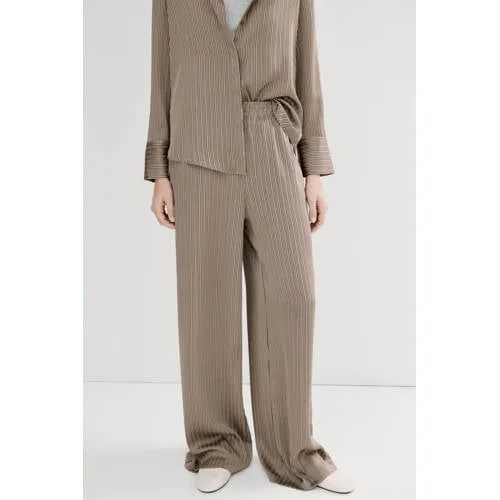 Ga voor ontspannen elegantie met deze Mango satijnen broek met hoge taille in een warme bruintint. De soepelvallende satijnstof geeft een subtiele glans, terwijl het rechte, losse ontwerp luchtig om het lichaam valt. De verticale strepen zorgen voor een lang, gestroomlijnd effect, ideaal als je een rustige maar verzorgde look zoekt.Losse pasvorm met satijnachtige glans Gemaakt van 100% polyester met een gladde satijnlook, gevoerd met 100% polyester voor extra comfort Loose fit met recht pijpontwerp, waardoor de broek ruim en soepel valt Hoge taille met elastische, verstelbare band voor een comfortabele en flexibele pasvorm Twee praktische zijzakken en sierzakken achter voor een nette uitstraling Lang model, geschikt om te dragen met zowel platte schoenen als hakken Gestreepte print in bruintinten voor een rustige en harmonieuze uitstralingCasual broek voor werk, weekend en reizenDeze casual broek is ideaal op dagen waarop comfort net zo belangrijk is als uitstraling. De stijl past bij zowel een ontspannen als een meer verzorgde outfit, afhankelijk van de top en schoenen waarmee je de broek combineert. De elastische tailleband maakt de broek ook prettig voor langere dagen onderweg of op kantoor.Mango: moderne stijl voor elke dagMango staat bekend om mode die trends volgt en toch draagbaar blijft in het dagelijks leven. Met aandacht voor pasvorm en details biedt Mango kledingstukken die makkelijk te combineren zijn en lang een vaste plek in je garderobe houden.Een soepele, gestreepte basisbroek die je zonder moeite een stijlvolle dagoutfit laat samenstellen.