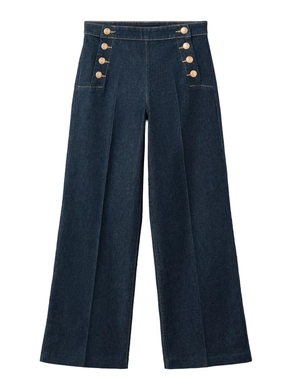 Design: Knoopsluiting, Paspelzak; Type sluiting: Knoopsluiting; Materiaal: Denim; Motief: Effen; Details: Plooien; Extra's: Contrasterende naden, Vaste grip; Wassing: Raw/unwashed; Lengte: Lang/maxi; Pasvorm: Wide leg; Taillehoogte: High waist