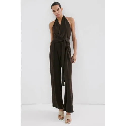 Deze langvallende bruine dames jumpsuit van Mango is een stijlvolle basis voor zomerse dagen en feestelijke avonden. De rechte snit zorgt voor een rustige, elegante lijn, terwijl de halterhals en gekruiste banden op de rug voor een vrouwelijke uitstraling zorgen. De soepele stof met lichte stretch vormt zich prettig rond je lichaam en beweegt makkelijk met je mee.Verfijnde details voor elke gelegenheid Lang ontwerp met rechte pijpen voor een gestroomlijnd silhouet Halterkraag met V-hals geeft een open, zomerse look Gekruiste banden op de rug voor een subtiel accent Mouwloos ontwerp, ideaal voor warme dagen en avonden Knoopsluiting bij de hals voor gemakkelijk aan- en uittrekken Afneembare ceintuur met strikje om je taille te accentueren Effen bruine kleur die rustig oogt en makkelijk te combineren is Geschikt voor feestelijke gelegenheden en nette dagelijkse outfitsVan zomerdag tot feestelijke avondIn de zomercollectie van Mango is deze jumpsuit een veelzijdig item. Overdag draag je hem met sandalen en een lichte tas. Voor een feestje of diner vervang je die eenvoudig door hakken en sieraden. Door het mouwloze model en de gladde, soepel vallende stof blijft het comfortabel, ook als je de jumpsuit langere tijd draagt.Mango: eigentijdse mode met een stijlvolle signatuurMango staat bekend om moderne collecties met een toegankelijke, modieuze uitstraling. De ontwerpen volgen de trends, maar blijven draagbaar in het dagelijks leven. Met deze jumpsuit kies je voor een doordacht ontwerp, gemaakt met aandacht voor pasvorm en stijlvolle details.Een comfortabele keuze als je graag met één kledingstuk een complete, verzorgde look creëert.