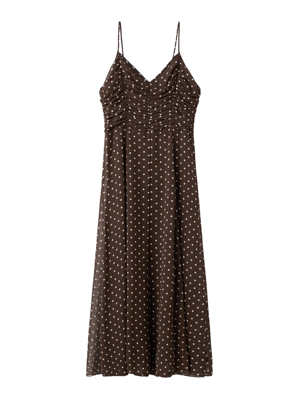 Voor zonnige dagen en lange avonden is deze donkerbruine midi zomerjurk met polkadotprint van Mango een lichte keuze. De vloeiende stof valt mooi om het lichaam en het A-lijn ontwerp geeft een silhouet dat niet strak aansluit. De donkerbruin/witte stippenprint zorgt voor een speelse uitstraling die past bij een tuinfeest of een etentje.Details die het verschil maken Midi lengte, valt rond de kuit voor een luchtige maar bedekte look A-lijn ontwerp dat soepel uitloopt vanaf de taille Gerimpelde halslijn met subtiel smockwerk voor extra structuur V-hals en fijne spaghettibandjes voor een zomerse uitstraling Ritssluiting aan de achterkant zodat de jurk makkelijk aan en uit gaat Vloeiende, soepele stof met zachte voering voor extra draagcomfort Polka dot print in donkerbruin/wit die goed combineert met neutrale accessoires Ontworpen zonder zakken voor een gladde, nette afwerkingVoor zomerse dagen en tuinfeestenDeze midi jurk komt goed tot zijn recht op zonnige dagen, tijdens een tuinfeest of bij een casual zomerse borrel. De soepele stof beweegt mee terwijl je loopt, zodat de jurk de hele dag prettig blijft zitten.Mango: eigentijdse mode met stijlgevoelMango staat bekend om moderne collecties met een heldere, draagbare stijl. De ontwerpen sluiten aan op de laatste trends, maar blijven tegelijk makkelijk te combineren in je dagelijkse garderobe. Met deze jurk haal je een doordacht ontworpen item in huis dat past bij een veelzijdige, modieuze kledingkast.Een lichte basis voor je zomerse garderobe.