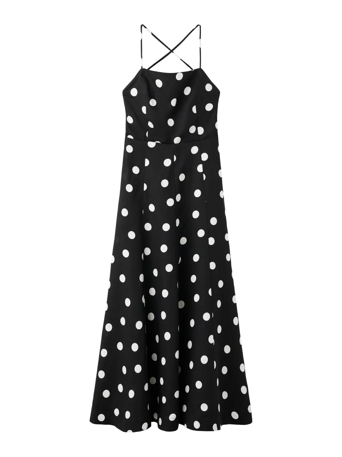 Voor een luchtige maar geklede look is deze Mango maxi jurk met stippenprint een passende keuze. De lange zwarte jurk met witte polka dots heeft een rechte pasvorm die soepel langs het lichaam valt. Door de combinatie van lyocell en linnen voelt de stof licht en ademend aan, ideaal voor warme dagen of zwoele avonden. De binnenvoering zorgt ervoor dat de jurk niet doorschijnt en fijn aanvoelt op de huid.Verfijnde details voor een feestelijke dag Lange maxi lengte met recht ontwerp voor een elegante, rustige lijn Zwarte basis met witte polka dot print voor een klassiek, speels effect Halternek en open rug met striksluiting geven een mooie achterkant Mouwloos model, prettig voor lente en zomer Verborgen ritssluiting aan de achterkant voor gemakkelijk aan- en uittrekken Lichte stof van lyocell en linnen die comfortabel aanvoelt op warme dagen Gevoerde binnenkant voor extra draagcomfort en mooie stofval Geschikt voor feestelijke gelegenheden en speciale etentjesVoor feestjes, diners en zomerse momentenDeze jurk leent zich goed voor bruiloften, tuinfeesten of een diner op vakantie. Met sandalen en een lichte shawl heb je een ontspannen look, met hakken en subtiele sieraden verandert de jurk in een feestelijke outfit.Mango: eigentijdse mode voor elke dagMango staat bekend om moderne collecties die trends vertalen naar draagbare mode voor alledag. De ontwerpen combineren een frisse stijl met doordachte details, zodat je er verzorgd uitziet op drukke werkdagen, maar ook bij bijzondere gelegenheden.Een comfortabele maxi jurk waarmee je zonder moeite een feestelijke en verzorgde look creëert.