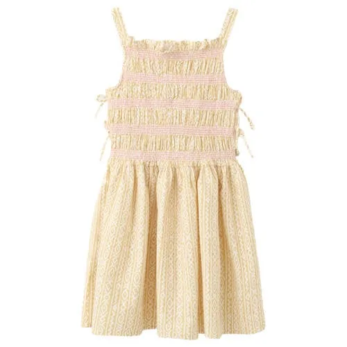 Deze ecru A-lijn meisjesjurk van katoen en linnen is een luchtige en praktische keuze voor warme dagen. De stofmix van 87% katoen en 13% linnen voelt zacht en soepel aan en geeft een rustige, natuurlijke uitstraling. Het korte, zwierige ontwerp met rechte halslijn en bandjes maakt de jurk geschikt voor school, feestjes of een dagje weg.Lichte jurk met speelse details A-lijn ontwerp dat mooi uitwaaiert en veel bewegingsvrijheid biedt Kort model, passend bij zomerse dagen of gecombineerd met een vest All over bedrukt ontwerp met contrasterende geborduurde details voor een speelse look Rechte halslijn met fijne bandjes voor een open, zomerse bovenkant Strikkendetail aan de zijkanten als sluiting en extra accent Gemaakt van 87% katoen en 13% linnen, geschikt voor dagelijks draagcomfort Mouwloos model, handig om te combineren met een T-shirt of blouse eronderVoor schooldagen en zomerse momentenDe jurk past goed in een preppy garderobe. Combineer met sandalen of sneakers en een licht vest op koelere dagen. Door het mouwloze model en de korte lengte is de jurk geschikt voor actieve schoolkinderen en tieners die zich graag vrij bewegen.Mango Kids voor eigentijdse kinderkledingMango Kids brengt kleding voor kinderen met oog voor actuele trends en draagbaar comfort. De collecties sluiten aan bij een moderne stijl, waarbij kleuren, prints en pasvormen zijn afgestemd op het dagelijks leven van kinderen.Een zomers jurkje dat er verzorgd uitziet en makkelijk te combineren is.