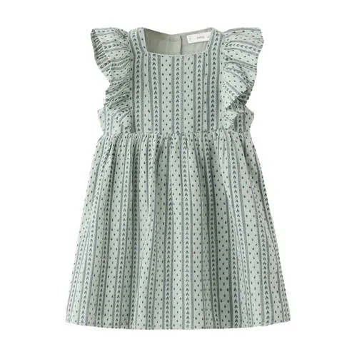 Deze vrolijke groene katoenen jurk voor meisjes is een luchtige favoriet voor zonnige dagen. De jurk is gemaakt van 100% katoen en voelt zacht en soepel aan op de huid. Het rechte ontwerp met A-lijn valt mooi om het lichaam en geeft genoeg bewegingsruimte om te rennen, spelen en dansen. De all over print en geborduurde details zorgen voor een speelse look die perfect past bij de preppy stijl van de collectie.Verfijnde details voor elke dag Gemaakt van 100% katoen, zacht en comfortabel voor peuters en kleuters A-lijn model en korte lengte, ideaal voor warme dagen All over print met geborduurde accenten voor een speels effect Vierkante hals en open rug met knoopsluiting aan de achterkant Ruche langs de schouderbanden voor een frisse, girly uitstraling Zonder zakken, waardoor de jurk licht en luchtig blijftSpeels en praktisch te dragenDe jurk is makkelijk aan en uit te trekken dankzij de knoopsluiting op de rug. Fijn voor drukke ochtenden en ideaal om te combineren met sandalen of sneakers. Een vest erover en je kind is ook op iets frisse dagen goed aangekleed.Mango Kids: eigentijdse stijl voor kinderenMango Kids brengt modieuze kinderkleding met een duidelijke, herkenbare stijl. De ontwerpen sluiten aan bij de laatste trends en zijn tegelijkertijd praktisch voor elke dag. Zo krijgt je kind kleding die goed voelt, fijn zit en er verzorgd uitziet.Een frisse, groene jurk die klaar is voor schooldagen, feestjes en alles daartussenin.