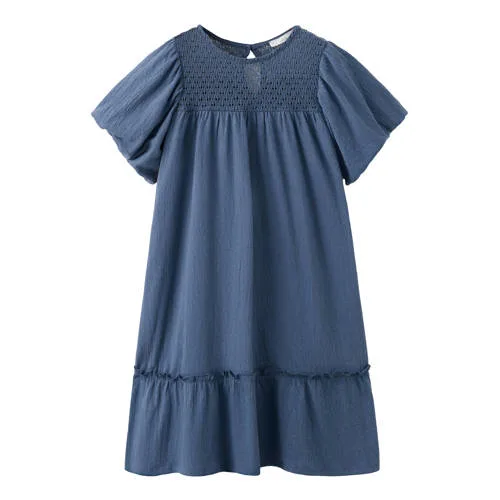 Deze Mango Kids blauwe meisjes jurk is geschikt voor momenten waarop het net iets gekleder mag, maar nog steeds comfortabel moet zijn. De korte blousejurk valt soepel om het lichaam en heeft een frisse, effen blauwe kleur die goed combineert met sandalen, sneakers of laarsjes. De ronde hals en korte pofmouwen zorgen voor een verzorgde uitstraling die past bij verschillende gelegenheden.Speelse details en prettig draagcomfort Korte jurk met vloeiende stof voor een luchtig gevoel tijdens het dragen Korte pofmouwen en plooien geven een speelse, meisjesachtige look Strook aan de onderkant voor extra zwier bij iedere beweging Druppelvormige uitsnede met knoopsluiting aan de achterkant maakt aan- en uittrekken eenvoudig Gemaakt van katoen, polyamide en elastaan voor een zachte touch en lichte stretch Elastische boord voor een pasvorm die aansluit zonder strak te zitten Effen blauwe kleur zonder zakken voor een rustig, verzorgd geheelGeschikt voor school, feestje of etentjeDe jurk is passend voor schoolkinderen en tieners die zich netjes willen kleden en toch vrij willen kunnen bewegen. Voor een casual schooldag combineer je de jurk met sneakers en een spijkerjack, voor een feestje volstaan bijvoorbeeld laarsjes en een haarband.Mango Kids voor alledaagse stijlMango Kids ontwerpt kleding die aansluit bij actuele trends en tegelijkertijd praktisch is voor dagelijks gebruik. De focus ligt op moderne pasvormen, toegankelijke ontwerpen en materialen die prettig aanvoelen. Zo ontstaat kinderkleding die er verzorgd uitziet en comfortabel te dragen is, van speelmoment tot familiediner.Een toegankelijke jurk die eenvoudig in de kledingkast past en vaak gedragen kan worden.