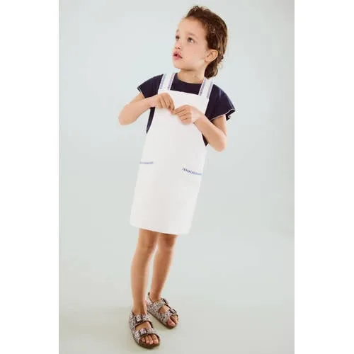 Deze witte denim jurk voor meisjes is een fijne basis voor de kledingkast van je peuter of kleuter. De jurk is gemaakt van 100% katoen met een denimachtige look, waardoor de stof stevig aanvoelt, maar toch soepel meebeweegt. De rechte snit en het korte model geven een frisse, moderne uitstraling die goed past bij de preppy collectie van Mango Kids.Praktische details voor elke dag Gemaakt van 100% katoen, voelt zacht aan op de huid en biedt prettig draagcomfort Denimachtige stof in de kleur wit voor een frisse, tijdloze look Rechte snit en kort ontwerp, ideaal voor actieve dagen Vierkante hals met bandjes zorgt voor een open, zomers silhouet Twee zakken aan de voorkant, handig voor kleine spulletjes Contrasterende geborduurde details en contrast stiksels voor een subtiel speels effect Sluiting met drukknoop maakt aan- en uittrekken eenvoudig Mouwloos ontwerp, goed te combineren met een T-shirt of vest eroverheenSpeels en draagbaar in elke combinatieDeze korte spijkerjurk past goed bij sandalen of sneakers en een luchtig T-shirt eronder. Zo is je kind klaar voor een schooldag, een dag bij opa en oma of een middag buitenspelen.Mango Kids: moderne stijl voor kinderenMango Kids staat voor eigentijdse kinderkleding met aandacht voor pasvorm en draagbaarheid. De collecties sluiten aan bij actuele trends, maar blijven eenvoudig en goed te combineren. Zo kies je voor kleding waar kinderen zich vrij in kunnen bewegen en die er verzorgd uitziet.Een veelzijdige jurk die je kind vaak kan dragen.