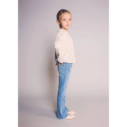 Deze Mango Kids flared jeans voor meisjes is een fijne basis voor alledaagse outfits en schooldagen. De medium blue denim kleur combineert gemakkelijk met T-shirts, truien en blouses. Door de mix van katoen met een beetje elastaan voelt de jeans soepel aan en beweegt je kind comfortabel mee, of er nu wordt gespeeld, gefietst of in de klas gezeten.Praktische details voor elke schooldag Flared pasvorm, met een iets uitlopende pijp voor een speelse look Gemaakt van 99% katoen en 1% elastaan voor lichte stretch Regular waist, zit rond de middel voor een vertrouwde pasvorm Lange pijpen met gerafelde broekzoom voor een stoer detail Knopen sluiting en riemlussen zodat er eenvoudig een riem gedragen kan worden Twee opgestikte zakken aan de voorkant en twee aan de achterkant Effen medium blue denim, makkelijk te combineren met andere kledingstukkenFlared jeans voor speels en stoer combinerenDeze lange jeans past goed bij sneakers, enkellaarsjes of sandalen. Combineer de flared stijl met een aangesloten top of een losse trui, afhankelijk van het seizoen. De elastische stof zorgt ervoor dat de broek prettig meebeweegt tijdens rennen, klimmen en spelen, terwijl de waistband netjes op de plek blijft.Mango Kids: eigentijdse stijl voor kinderenMango Kids staat voor moderne, draagbare kleding voor kinderen, met aandacht voor pasvorm en uitstraling. De collecties sluiten aan bij de huidige trends en zijn tegelijk praktisch in het dagelijks gebruik. Met deze jeans kies je voor een betrouwbaar merk met oog voor detail.Een comfortabele flared jeans die klaar is voor naar school en alle momenten daaromheen.
