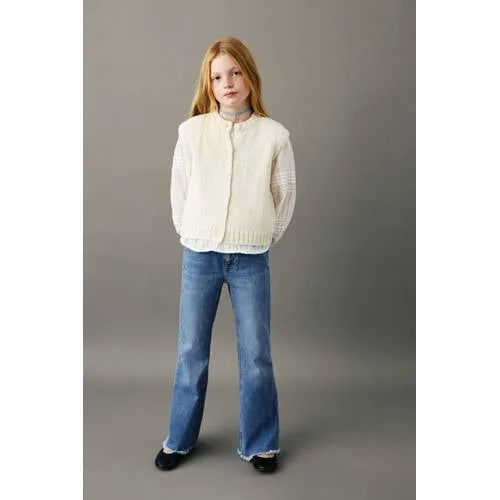Deze Mango Kids flared jeans geeft elke outfit een relaxte, maar verzorgde uitstraling. De spijkerbroek heeft een lange, rechte pijp met subtiele uitlopende flared zoom, wat zorgt voor een speels effect. De kleur changeant blauw, ook wel medium blue denim, is makkelijk te combineren met T-shirts, truien en blouses voor schooldagen en weekendavonturen.Comfortabele flared pasvorm voor elke dag Flared fit met lang ontwerp voor een moderne look Regular waist taillehoogte voor een comfortabele pasvorm rond de heupen Gemaakt van 99% katoen en 1% elastaan voor een stevige, maar toch elastische stof Knoop- en ritssluiting met riemlussen voor een extra riem als dat nodig is 5-pocket model met twee zijzakken, achterzakken en een kleine muntzak Gerafelde zomen voor een casual, gedragen effect Spijkerstofdetails en platte structuur midden voor een klassieke denim lookPraktisch en soepel in het dagelijks gebruikDe flared jeans is ideaal voor elke dag, of het nu naar school, speelafspraak of familiebezoek is. De elastische stof beweegt makkelijk mee tijdens rennen, fietsen en spelen. Door de standaardlengte valt de broek mooi over sneakers, laarsjes of sandalen. De rits- en knoopsluiting maakt aan- en uittrekken eenvoudig.Mango Kids: eigentijdse stijl voor kinderenMango Kids staat bekend om modieuze kindercollecties met aandacht voor draaggemak. De ontwerpen sluiten aan op de laatste trends, maar blijven toch toegankelijk en makkelijk te combineren. Zo ontstaat kinderkleding die prettig zit, er verzorgd uitziet en past bij het dagelijkse leven van actieve kinderen.Een praktische basisbroek die vaak uit de kast gepakt zal worden.