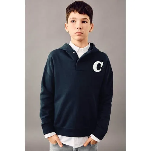 Deze Mango Kids sweater met capuchon is een praktische basic voor elke dag. De zachte katoenen stof met geborstelde binnenkant voelt comfortabel aan op de huid en geeft extra warmte op koelere dagen. Het bedrukt ontwerp met backprint en subtiel borduursel aan de voorkant zorgt voor een moderne uitstraling met een rustig dessin. Dankzij de capuchon en de praktische sluiting met drie knopen bij de hals past de sweater goed bij allerlei outfits.Praktische details voor dagelijks draagplezier Gemaakt van 80% katoen en 20% polyester, voor een zachte en vormvaste stof Geborstelde binnenkant van katoen voor extra warmte en een zacht gevoel Capuchon en lange mouwen, ideaal voor frisse dagen en laagjes Voorsluiting met drie knopen maakt aan- en uittrekken gemakkelijker Bedrukt ontwerp met backprint en borduursel voor een moderne, casual uitstraling Zonder zakken voor een rustige, gestroomlijnde lookVoor school, thuis en vrije tijdDeze sweater is geschikt voor allerlei momenten, van schooldagen tot ontspannen middagen thuis. De stof voelt comfortabel aan tijdens het spelen en bewegen, terwijl de capuchon net wat extra warmte biedt buiten. Combineer met een jeans of jogger voor een dagelijkse outfit.Mango Kids: eigentijdse stijl voor kinderenMango Kids biedt moderne kinderkleding met oog voor detail en draaggemak. De ontwerpen sluiten aan op actuele trends, maar blijven tegelijkertijd praktisch en toegankelijk. Zo krijgt de kledingkast een frisse update met stukken die vaak en graag gedragen worden.Een veelzijdige sweater die comfort en een casual uitstraling combineert in één praktisch kledingstuk.