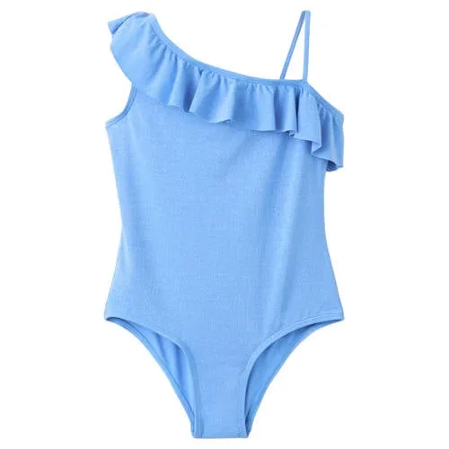 Dit blauwe meisjes badpak met one shoulder is geschikt voor dagen aan het water. Het asymmetrische ontwerp met dunne bandjes en ruches zorgt voor een opvallend silhouet, terwijl de subtiele glitters uit de lurexstof het licht opvangen. Door de elastische stof sluit het badpak goed aan en blijft het netjes op zijn plaats tijdens zwemmen en spelen.Details voor strand en zwembad Asymmetrisch one shoulder design voor een moderne uitstraling Lurexstof met glitters voor een subtiele glans in het zonlicht Ruchesdetail langs de bovenrand voor een speels accent Opening aan de achterkant voor extra ventilatie Gemaakt van 77% polyamide, 13% elastomeer en 10% metaal draad voor een soepele, rekbare pasvorm Gevoerd aan de binnenkant voor een zachte touch op de huid Effen blauwe kleur, goed te combineren met een short of strandjurkjeHandig in gebruikHet badpak sluit mooi aan bij een preppy stijl. Handwas wordt geadviseerd, en het mag niet in de droogtrommel of onder het strijkijzer. In verband met hygiëne dient badkleding altijd gepast te worden over het eigen ondergoed.Mango Kids met oog voor kindermodeMango Kids biedt kinderkleding met een eigentijdse uitstraling en aandacht voor details. De ontwerpen sluiten aan bij de nieuwste trends en blijven tegelijk geschikt voor alledag. Je kiest voor een merk dat mode voor kinderen combineert met draagcomfort en praktische oplossingen voor ouders.Een badpak waarmee stranddagen en zwembadmomenten zorgeloos en stijlvol worden ingevuld.