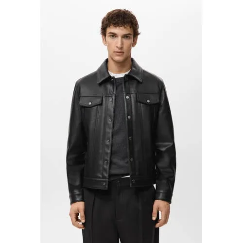 Deze Mango Man imitatieleren jas zwart heeft een recht vallend model met een glad nappaleereffect voor een verzorgde, strakke uitstraling. De jas sluit aan de voorkant met metalen knopen en heeft een klassieke overhemdkraag. De lange mouwen zijn afgewerkt met manchetten met knoopsluiting, waardoor het ontwerp rustig oogt en goed aansluit bij uiteenlopende combinaties in het najaar en in de winter.Functioneel ontwerp met slimme details Rechte pasvorm voor comfortabel draaggemak zonder te strak gevoel Overhemdkraag en doorknoopsluiting met metalen knopen aan de voorkant Twee borstzakken met klep, paspel en knoop voor kleine dagelijkse spullen Twee zijzakken die handig zijn om handen in weg te steken onderweg Paspelzak aan de binnenkant voor het veilig opbergen van waardevolle items Volledige binnenvoering voor extra comfort op koelere dagen Zwarte kleur die goed past bij zowel casual combinaties als meer geklede outfitsGeschikt voor dagelijks gebruikMet de gevoerde binnenkant biedt deze jas extra warmte op frisse herfstdagen en op mildere winterdagen. De verschillende zakken geven ruimte aan sleutels, telefoon en pasjes, zodat veelgebruikte spullen snel bij de hand zijn zonder extra tas.Mango Man stijlMango Man richt zich op eigentijdse herenmode met aandacht voor pasvorm en uitgewerkte details. De ontwerpen combineren een moderne uitstraling met praktisch gebruiksgemak, waardoor een garderobe ontstaat die past bij zowel werkdagen als vrije momenten.Een veelzijdige jas die dagelijks bijdraagt aan een verzorgde, goed gecoördineerde look.