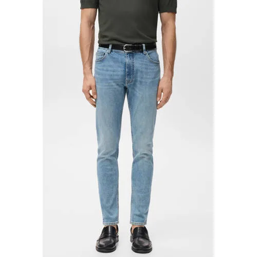 Deze Mango Man Jude skinny jeans heeft een pasvorm langs het been. Dit model heeft pijpen tot op de enkels. De kleur is blauw met een gewassen effect, de sluiting heeft een rits en een knoop. Dit model is gemaakt voor heren en de pijpen vallen smal.