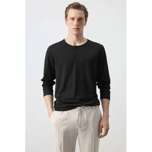 Deze zwarte heren longsleeve in Henley-stijl van Mango Man is een rustige basic met een moderne uitstraling. Het effen ontwerp met ronde hals en korte knoopsluiting maakt het shirt geschikt voor zowel vrije tijd als een nette, casual look. De zachte stof met lyocel voelt soepel aan op de huid en volgt je bewegingen gemakkelijk.Verfijnde basics voor elke dag Henley-stijl met korte knoopsluiting voor een eigentijdse uitstraling Ronde hals die mooi aansluit zonder te strak te zitten Lange mouwen, ideaal voor koelere dagen of laagjes Effen zwarte kleur, makkelijk te combineren met jeans of chino Soepel materiaal met lyocel voor een zachte touch Rechte zoom voor een verzorgd silhouet, zowel ingestopt als los gedragen Modern heren shirt in standaardmaten, 1 stuk per verpakkingVeelzijdig shirt in je garderobeDeze longsleeve is een praktische keuze voor doordeweeks. Draag het met een jeans en sneakers voor een ontspannen look of combineer het met een nette broek voor een meer geklede stijl. Ook onder een overshirt of licht jack komt dit shirt goed tot zijn recht.Mango Man: moderne herenmodeMango Man staat voor actuele herenmode met een heldere, toegankelijke stijl. De collectie biedt draagbare items die goed aansluiten op het dagelijks leven, met aandacht voor pasvorm en materialen. Zo vul je je kledingkast gemakkelijk aan met stukken waar je vaak naar grijpt.Een tijdloze basic waar je het hele seizoen plezier van hebt.
