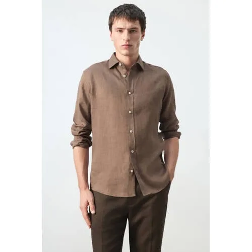 Ga voor een tijdloze basis in je garderobe met dit donkerbruine linnen overhemd voor heren van Mango Man. De regular fit valt recht langs het lichaam en geeft een ontspannen, maar verzorgde look. Door de stof van 100% linnen voelt het overhemd licht en luchtig aan, ideaal voor warmere dagen of als laag over een T-shirt.Details die het verschil maken Gemaakt van 100% linnen voor een ademend en fris gevoel Regular fit voor een comfortabele pasvorm met genoeg bewegingsruimte Klassieke overhemdkraag en lange mouwen met knoopmanchetten voor een nette uitstraling Voorzien van een volledige knoopsluiting aan de voorkant Afgeronde zoom, waardoor het overhemd zowel los als ingestopt goed valt Achterplooien zorgen voor extra draagcomfort in de rug Effen donkerbruine kleur die gemakkelijk te combineren is met jeans, chino of korte broek Wasbaar op 30 graden, handig in het dagelijkse onderhoudCasual en verzorgd in éénDit linnen overhemd past goed bij relaxed kantoorwerk, een etentje of een weekend weg. Draag het open over een T-shirt met een lichte jeans voor een casual look, of sluit de knopen en combineer met een chino voor een meer geklede stijl.De stijl van Mango ManMango Man staat voor moderne herenmode met aandacht voor pasvorm en draaggemak. De collecties combineren actuele trends met rustige basics, zodat je je kledingkast eenvoudig kunt opbouwen rond stukken die je vaak en graag draagt.Een luchtig overhemd dat je makkelijk erbij pakt op dagen dat je er verzorgd uit wilt zien.