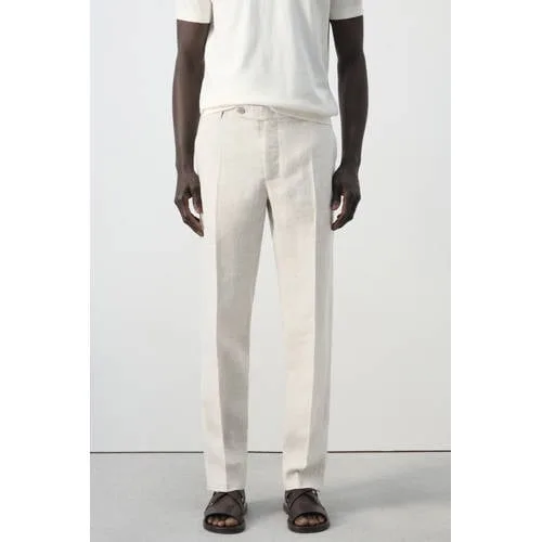 Deze lichtbeige linnen pantalon van Mango Man is een veelzijdige basis voor je garderobe. De broek komt uit de Essentials collectie, die is gemaakt om lang mee te gaan. De slanke pasvorm sluit mooi aan zonder te strak te zitten en de vaste geperste vouw aan voor- en achterkant geeft direct een verzorgde uitstraling. Het linnen voelt licht en luchtig aan, ideaal voor warmere dagen of lange werkdagen.Verfijnde details en praktisch comfort Gemaakt van 100% linnen voor een verkoelend en ademend gevoel Slanke pasvorm met standaardlengte voor een moderne, nette look Gekruiste taille met riemlussen voor een goed aansluitende band Knoop-, haak- en ritssluiting voor een stevige en nette afwerking Twee zijzakken met bies en een subtiel muntzakje aan de voorkant Twee achterzakken met klep en knoop voor extra opbergruimte Lichtbeige kleur met ruitstructuur die makkelijk te combineren isGeschikt voor werk, diner of vrije tijdDeze pantalon leent zich goed voor allerlei gelegenheden. Combineer met een overhemd en nette schoenen voor een zakelijke dag, of draag de broek met een T-shirt en sneakers voor een meer ontspannen outfit. Het lichte linnen maakt de broek prettig om de hele dag te dragen.Mango Man: moderne klassiekersMango Man richt zich op tijdloze, moderne kleding met een heldere pasvorm en aandacht voor details. De collectie bestaat uit items die je makkelijk combineert en die lang meegaan in je dagelijkse garderobe.Een comfortabele, verzorgde keuze waar je het hele seizoen plezier van hebt.