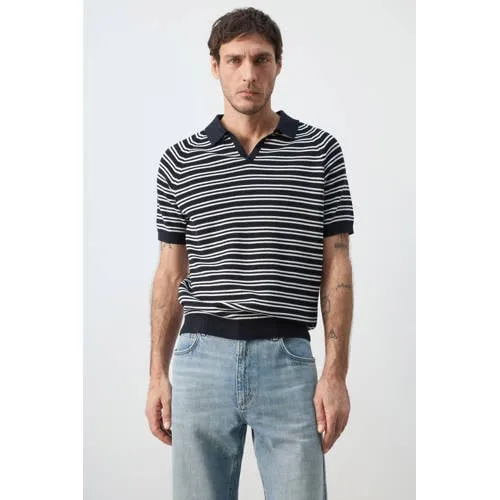 Deze fijngebreide heren polo van katoen van Mango Man is een basic met een moderne uitstraling. De donkerblauwe kleur in marine tint en het subtiele strepenontwerp zorgen voor een rustige, verzorgde look die zowel casual als netjes te dragen is. De regular fit laat het shirt ontspannen langs het lichaam vallen, zonder te wijd of te strak te zitten.Verzorgde details in fijngebreide kwaliteit Gemaakt van 100% katoen, met een zachte, fijngebreide stof die prettig aanvoelt op de huid Regular fit en standaardlengte voor een vertrouwde pasvorm Strepenontwerp in marine tint voor een rustige, makkelijk te combineren look Polokraag zonder knopen voor een overzichtelijke, cleane halslijn Geribde hals, korte mouwen en boord voor een nette afwerking Rechte zoom die zowel in als over de broek gedragen kan worden Geschikt voor handwas volgens het wasvoorschriftGeschikt voor werk, weekend en vrije tijdDeze polo combineer je eenvoudig met een chino of jeans voor op kantoor, en met een korte broek in het weekend. De katoenen kwaliteit maakt het shirt geschikt voor dagelijks gebruik, in elk seizoen.Mango Man: moderne stijl voor elke dagMango Man biedt eigentijdse collecties met heldere lijnen en draagbare ontwerpen. De nadruk ligt op stijlvolle basics en moderne items die goed te combineren zijn, zodat je gemakkelijk outfits samenstelt voor verschillende momenten.Een praktische polo waarmee je op een ontspannen manier verzorgd voor de dag komt.
