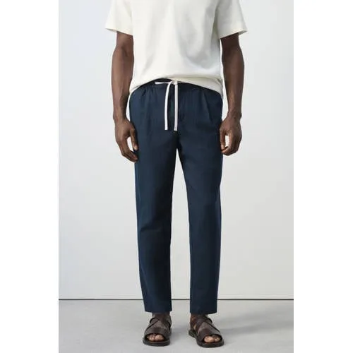 Deze marinekleurige slim-fit heren broek van katoen en linnen van Mango Man combineert het gemak van een joggingbroek met de uitstraling van een nette pantalon. De elastische tailleband met verstelbaar koord zorgt voor een comfortabele pasvorm, terwijl de bandplooien en de cropped lengte een moderne, verzorgde look geven. Deze broek valt slank langs het been en is gemaakt van een luchtige combinatie van katoen en linnen, ideaal voor warmere dagen.Praktische details en modern design Gemaakt van 55% katoen en 45% linnen voor een lichte, ademende stof Slim-fit pasvorm met cropped lengte voor een eigentijdse uitstraling Elastische tailleband met verstelbaar koord, zichtbaar of verborgen te dragen Dubbele knoopsluiting en ritssluiting aan de voorkant voor een nette afwerking Lussen voor riem, zodat de broek ook met riem gedragen kan worden Twee voorzakken en twee paspelzakken met knoop aan de achterkant Effen marine kleur, makkelijk te combineren binnen een moderne garderobeVan werkdag tot weekendDeze broek is geschikt voor verschillende momenten. In combinatie met een overhemd en nette schoenen ontstaat een semi-formele outfit. Met een T-shirt en sneakers krijgt de broek direct een meer ontspannen, casual uitstraling. De luchtige stof maakt dit model prettig om de hele dag te dragen.Mango Man: moderne stijl voor elke dagMango Man staat voor modieuze, toegankelijke kleding met een doordachte pasvorm. De collecties sluiten aan op een moderne levensstijl, met items die goed te combineren zijn en geschikt zijn voor dagelijks gebruik. Zo kun je eenvoudig een garderobe opbouwen die betrouwbaar en actueel aanvoelt.Een veelzijdige broek die comfort en een verzorgde look op een lichte manier samenbrengt.