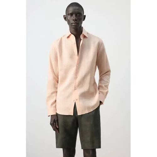 Fris, licht en goed te combineren, dit Mango Man linnen overhemd is een basisitem voor warme dagen en laagjes in het tussenseizoen. Het effen pasteloranje geeft direct een moderne, ontspannen uitstraling, terwijl de slim-fit pasvorm aangesloten valt zonder te strak te zitten. Gemaakt van 100% linnen voelt het materiaal luchtig aan en helpt het om je huid koel te houden.Essentiële details voor elke dag Gemaakt van 100% linnen, een ademende stof die prettig aanvoelt op de huid Slim-fit pasvorm voor een moderne, slanke look Lange mouwen met knoopmanchetten voor een nette afwerking Klassieke overhemdkraag en knoopsluiting aan de voorkant Afgeronde zoom, waardoor het overhemd zowel in als over de broek gedragen kan worden Effen pasteloranje kleur, goed te combineren met jeans, chino of korte broek Wasbaar op 40 graden, handig voor regelmatig dragenCasual of smart casualDit overhemd past goed bij een casual jeans voor een relaxte dag, maar kan ook met een chino voor een nette, maar toch ontspannen outfit. Door de standaardlengte en de afgeronde zoom kies je eenvoudig of je het overhemd los draagt of ingestopt.Mango Man essentialsMango Man staat bekend om tijdloze items met een moderne pasvorm. De Essentials collectie richt zich op kledingstukken die seizoen na seizoen in je kast blijven. Dit overhemd sluit daar op aan met zijn heldere pasvorm, doordachte details en draagbare kleur.Een betrouwbare basis voor outfits waar je het hele seizoen plezier van hebt.