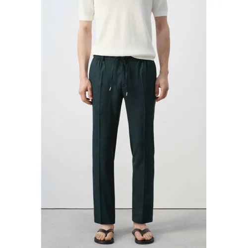 Voor een ontspannen maar verzorgde look is deze donkergroene slim-fit heren chino met linnen een fijne basis. De broek heeft een moderne crop lengte waardoor je enkels subtiel zichtbaar zijn, ideaal met sneakers of nette schoenen. De linnenmix stof geeft een luchtig en soepel gevoel, terwijl de slim-fit pasvorm mooi langs het been valt zonder strak te zitten.Praktische details en draagcomfort Linnenmix stof met een lichte, comfortabele touch, prettig voor warmer weer Crop lengte voor een moderne, iets kortere pijp Elastische tailleband met verstelbaar koord voor een flexibele pasvorm Koord kan zichtbaar gedragen worden of verborgen aan de binnenkant worden vastgeknoopt Lussen voor riem zodat je ook met een riem kunt stylen Sluiting aan de voorkant met rits en haaksluiting Twee zijzakken en zakken achter voor kleine essentials Voering met katoen voor een prettig gevoel aan de binnenkant Effen donkergroene kleur die gemakkelijk te combineren isGeschikt voor werk, weekend en vakantieDeze chino past bij veel momenten op een dag. Combineer met een T-shirt en sneakers voor een casual outfit of met een overhemd en nette schoenen voor een meer geklede stijl. Door de elastische taille met koord voelt de broek ook tijdens lange dagen of reizen comfortabel aan.Mango Man: eigentijdse stijl voor elke dagMango Man staat voor toegankelijke herenmode met een moderne uitstraling. De collecties combineren actuele trends met draagbare ontwerpen die goed in een dagelijkse garderobe passen. Met deze broek kies je voor een doordacht ontwerp, fijne materialen en een stijl die lang mee kan.Een veelzijdige chino die je garderobe rustig en stijlvol aanvult.