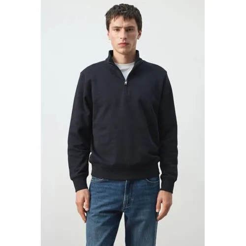 Deze donkerblauwe Mango Man sweater van katoen is een rustige basic voor elke dag. De marinekleurige trui heeft een moderne uitstraling door de halve rits en opstaande kraag, en laat zich makkelijk combineren met je favoriete jeans of chino. De regular fit sluit ontspannen aan op het lichaam en de lange mouwen zorgen voor comfortabele warmte op koelere dagen.Praktische details voor dagelijks dragen Gemaakt van 100% katoen, voelt zacht en soepel aan op de huid Regular fit, biedt voldoende ruimte zonder wijd te vallen Opstaande kraag met halve rits voor verstelbare warmte en een nette look Geribde boorden en zoom, zodat de trui mooi in model blijft Effen marinekleur, eenvoudig te combineren in een dagelijkse garderobe Zonder zakken, zorgt voor een strakke en rustige uitstraling Lange mouwen, ideaal voor kantoor, thuis of een casual afspraakVeelzijdig in je dagelijkse outfitsDraag deze sweater met een jeans en sneakers voor een casual dag, of combineer met een chino en nette schoenen voor een meer verzorgde look. De halve rits laat ruimte voor variatie, open voor een ontspannen uitstraling of gesloten als je meer warmte wilt.Mango Man: moderne stijl voor elke dagMango Man staat bekend om strak vormgegeven kleding met een eigentijdse stijl. De collecties zijn ontworpen voor mannen die houden van heldere lijnen, draagbare trends en betrouwbare kwaliteit. Deze trui past daar naadloos in en biedt een praktische basis waar je lang plezier van hebt.Een toegankelijke essential die je garderobe rustig, stijlvol en compleet maakt.