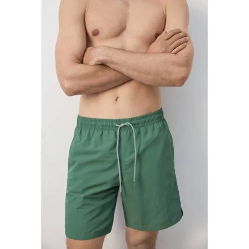 Ga zorgeloos het water in met deze Mango Man zwemshort voor heren in kakigroen. Het korte, rechte model zit comfortabel rond de heupen door de elastische tailleband met verstelbaar koord. De mesh voering geeft extra ondersteuning, terwijl de effen kleur rustig oogt en makkelijk combineert met je favoriete T-shirt of linnen overhemd.Praktische details voor strand en zwembad Elastische tailleband met koord, zodat de pasvorm eenvoudig is aan te passen Twee zijzakken voor kleine essentials zoals een sleutel of pasje Achterzak met klittenbandsluiting om spullen beter op hun plek te houden Kleine zijsplitjes onderaan de pijpen voor iets meer bewegingsvrijheid Mesh voering aan de binnenkant voor extra comfort tijdens het dragen Effen kakigroene kleur die rustig en tijdloos oogt Geschikt voor handwas, niet strijken en niet in de droogtrommel drogen Hygiënisch passen: badkleding dient gepast te worden over je eigen ondergoedComfortabel in en om het waterDe zwemshort is gemaakt van een soepele, licht aanvoelende stof die prettig draagt aan het strand, bij het zwembad of tijdens een dagje aan het water. Door de praktische zakken en de verstelbare taille draag je deze short net zo makkelijk onderweg naar huis.Mango Man: moderne stijl voor elke dagMango Man staat voor moderne, toegankelijke mode met een heldere stijl. De collecties combineren eigentijdse pasvormen met fijne basisstukken die je seizoen na seizoen kunt dragen.Een veelzijdige zwemshort die je zonder moeite meeneemt van waterpret naar relaxte momenten eromheen.
