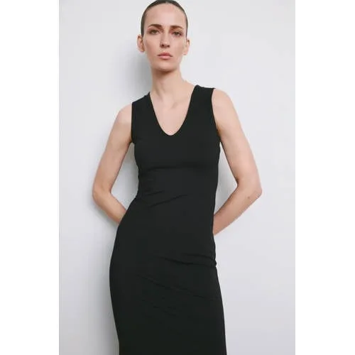 Deze zwarte Mango kokerjurk is een praktische keuze voor dagen waarop je er verzorgd uit wilt zien zonder te veel na te denken over je outfit. Het getailleerde ontwerp volgt subtiel je silhouet, terwijl de midi lengte en V-hals voor een rustige, moderne uitstraling zorgen. De fijngebreide stretchstof voelt soepel aan op de huid en beweegt makkelijk met je mee, van kantoor tot diner.Kenmerken van deze midi jurk Getailleerde pasvorm die het silhouet duidelijk laat uitkomen Midi lengte die rond de knie valt voor een rustige uitstraling V-hals die de halslijn optisch verlengt Mouwloos model met brede schouderbanden voor prettige bedekking Split aan de onderkant voor extra bewegingsvrijheid tijdens het lopen Zonder sluiting, de jurk trek je eenvoudig over het hoofd aan Effen zwarte kleur, makkelijk te combineren met verschillende stijlen Fijngebreide stretchkwaliteit voor een soepele, aansluitende fitVan werkdag tot avond uitDeze midi kokerjurk uit de Daily collectie leent zich goed voor uiteenlopende momenten. Combineer met een blazer en loafers voor een werkdag, of draag de jurk met hakken en een compacte schoudertas voor een etentje. In het voorjaar is een lichte trenchcoat erover een logische extra laag.Mango: moderne mode voor elke dagMango staat bekend om eigentijdse collecties met een heldere stijl. De ontwerpen sluiten aan bij het dagelijks leven, met aandacht voor pasvorm en draagcomfort. Zo voeg je makkelijk kledingstukken toe aan je garderobe waar je vaak naar grijpt.Deze zwarte jurk is geschikt voor verschillende gelegenheden in het seizoen.