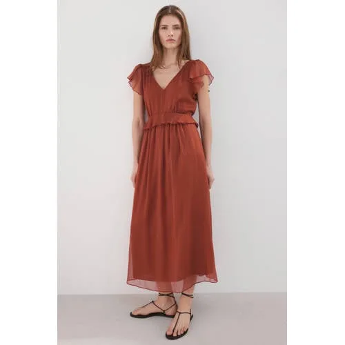 Deze terracotta Mango midi jurk is een stijlvolle keuze voor momenten waarop je er net iets verzorgder uit wilt zien, zonder dat het ingewikkeld hoeft te zijn. Het lange, rechte ontwerp valt soepel om het lichaam en de middellange lengte geeft een rustige, elegante uitstraling. De zachte voering zorgt dat de stof mooi valt en niet doorschijnt, zodat je je de hele dag zeker voelt.Verfijnde details in een rustig ontwerp Lang model met rechte snit voor een moderne, ontspannen look Ruches detail aan de voorkant zorgt voor een subtiele, vrouwelijke touch V-hals die mooi opent bij de halslijn zonder te diep te zijn Korte kapmouwen die de bovenarmen licht bedekken Terracotta kleur die warmte toevoegt aan je outfit Binnenvoering voor extra comfort en een mooie, gladde uitstraling Verborgen ritssluiting aan de achterkant om de jurk gemakkelijk aan en uit te trekken Effen ontwerp dat rustig oogt en makkelijk te combineren is met accessoiresVoor feestelijke momenten en speciale dagenDeze midi jurk past goed bij gelegenheden zoals een bruiloft, een diner of een feest. Met hakken en subtiele sieraden krijgt de jurk een feestelijke uitstraling, met sandalen of nette ballerina's is de look juist iets meer ontspannen.Mango: eigentijdse stijl voor elke dagMango staat bekend om modieuze items met een toegankelijke stijl. De collecties volgen de trends, maar blijven toch draagbaar voor alledaagse en speciale momenten. Zo haal je met deze jurk een betrouwbare basis in huis waar je vaak en met plezier naar zult grijpen.Een rustige, terracotta jurk waarmee je eenvoudig een verzorgde, feestelijke look creëert.