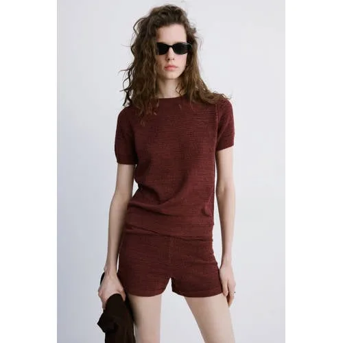 Deze korte damesbroek in roodbruin breisel is een praktische basic voor dagen waarop je relaxed maar verzorgd voor de dag wilt komen. Het middengrove breisel geeft een zachte, comfortabele touch en het mini-ontwerp valt kort op het bovenbeen. Dankzij de regular fit volgt de broek soepel je lichaam, zonder strak aan te voelen.Details die je elke dag draagt Middengrof breisel voor een zachte, comfortabele feel op de huid Mini-ontwerp dat kort valt en je benen laat zien Getailleerd ontwerp voor een aangesloten silhouet Verstelbare taille met elastiek voor een flexibele pasvorm Zonder sluiting, je trekt de short eenvoudig aan en uit Elastische tailleband op regular waist hoogte Effen roodbruine kleur die makkelijk combineert met tops en T-shirts Casual short die ook als sweatshorts te dragen isCasual short voor alledaagse looksDeze korte broek past goed in je dagelijkse garderobe voor het voorjaar. Ideaal met een los T-shirt en sneakers voor een vrije dag, of met een luchtige blouse voor een wat gekledere look. Het ontbreken van zakken zorgt voor een strak en rustig beeld rond de heupen.Mango: modern en draagbaarMango biedt modieuze items met een toegankelijke stijl. De collecties sluiten aan op actuele trends en zijn tegelijkertijd makkelijk te combineren met wat je al hebt. Zo voeg je met deze short eenvoudig een modern en betrouwbaar kledingstuk toe aan je dagelijkse outfits.Een comfortabele basisshort waar je in het voorjaar en de zomer vaak naar grijpt.