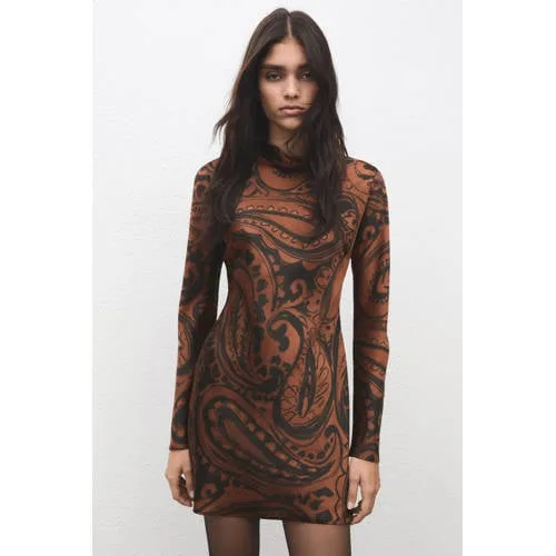 Deze Mango satijnen jurk met col en koperkleurige all over print is een moderne keuze voor uiteenlopende gelegenheden. De korte lengte geeft een open uitstraling, terwijl de lange rechte mouwen en col juist meer bedekking bieden. De koperkleurige print valt gelijk op en zorgt voor een levendig geheel. Dankzij de ritssluiting aan de achterkant is de jurk eenvoudig aan en uit te trekken.Stijlvolle details voor dagelijks gebruik Gemaakt van satijn voor een gladde en licht glanzende uitstraling Colkraag voor een gesloten en elegante halslijn Lange rechte mouwen voor extra bedekking en een rustige lijn Korte lengte die mooi in balans is met de hoge hals All over print in koperkleur voor een speels en dynamisch effect Ritssluiting achter voor een nette pasvorm Ontwerp zonder zakken voor een strak silhouetGeschikt voor uiteenlopende momentenMet deze jurk is een verzorgde look snel geregeld. De satijnen stof en de all over print maken het model geschikt voor etentjes, feestelijke momenten en avonden uit, maar ook voor een dag op kantoor met de juiste accessoires.Mango: eigentijdse mode met een duidelijke stijlMango staat bekend om modieuze ontwerpen met heldere lijnen en doordachte details. Het merk combineert actuele trends met draagbare pasvormen, waardoor de collectie goed aansluit op een moderne garderobe.Een jurk die met weinig moeite zorgt voor een complete en stijlvolle outfit.